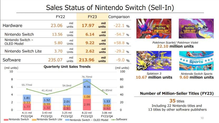 Los buenos resultados de la empresa también dan cuenta que el ecosistema ya superó los mil millones de juegos vendidos a nivel global, destacando a entregas como Pokémon Escarlata y Púrpura, Splatoon 3 y Nintendo Switch Sports.