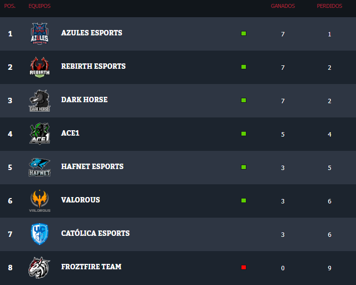 Con esto, la tabla de posiciones de la LVP Chile queda con un virtual empate en el primer lugar -entre Azules, Rebirth y Dark Horse-, mientras que en el quinto lugar, Hafnet, Valorous y Católica comparten el mismo número de victorias. Cabe destacar que aún no se juega el duelo entre Azules y Hafnet, ante lo cual, podría asegurar el camino para el «bulla» de League of Legends.