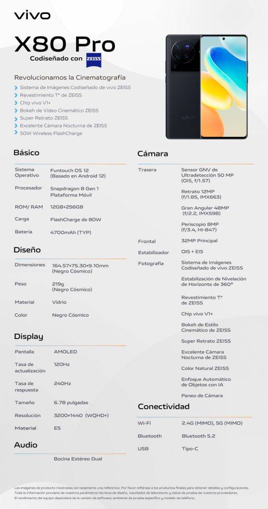 vivo X80 Pro 5G llega al mercado en color Negro Cósmico y estará disponible de forma online desde el 06 de julio y en tiendas a partir del 07 del mismo mes, de manera especial por lanzamiento, todos los X80 Pro 5G traen de regalo los audífonos inalámbricos vivo TWS 2 ANC, con un precio referencial de $1.299.000.