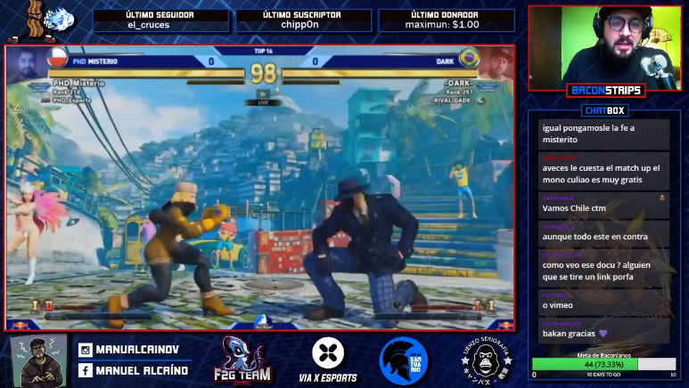 El canal de Twitch de Bacon Strips, se convirtió en el único oficial que retransmitió la competencia para Chile, incluso recibió los comentarios y apoyo de la comunidad fighting de Perú y Brasil, alcanzando un peak de 200 viewers.