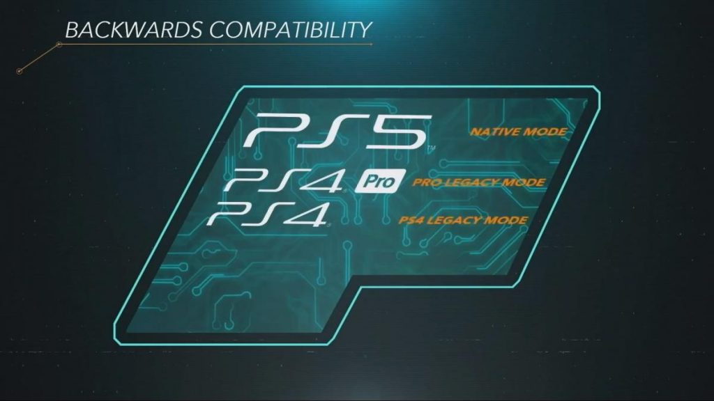 En la presentación de las características técnicas de la nueva consola, Mark Cerny, arquitecto del sistema PS5, anunció que el hardware tendrá retrocompatibilidad con juegos de PlayStation 4, esto gracias a que la PS5 podrá copiar juegos de PS4 en su SSD, por lo que contará con dos modos: Pro Legacy Mode y PS4 Legacy Mode, además del modo nativo de PS5.