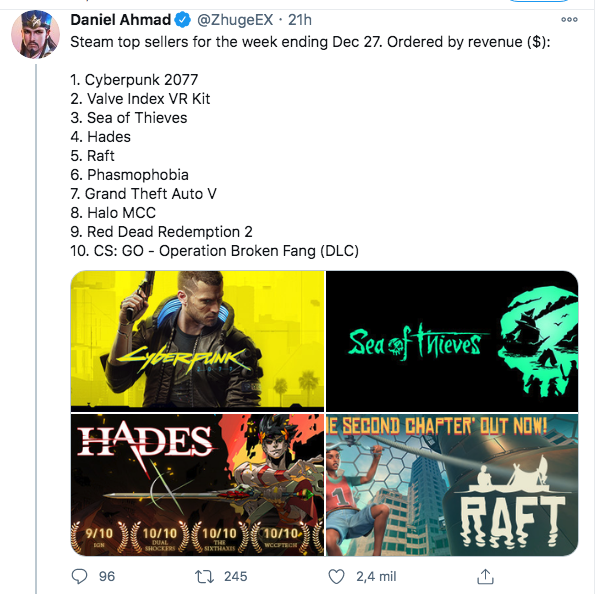 Muy de cerca a Cyberpunk 2077 le siguen 2. Valve Index VR Kit, Sea of Thieves, Hades y Raft.