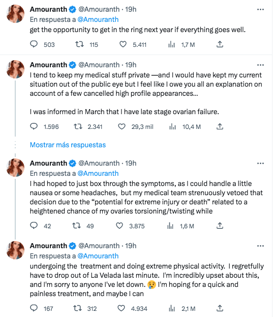 «Me pondré inyecciones diarias durante 7-14 días durante los cuales sufriré (potencialmente) dolores de cabeza, náuseas y dolores y también me avisaron de tener precauciones contra actividades de alto impacto. Descubrí la gravedad de mi diagnóstico después de que ya había accedido a aparecer en La Velada y decidí que seguiría adelante y esperaría a ponerme las inyecciones después del evento para seguir compitiendo. Pero debido a los desarrollos médicos extremos, tengo que empezar con ellos hoy», agregó.