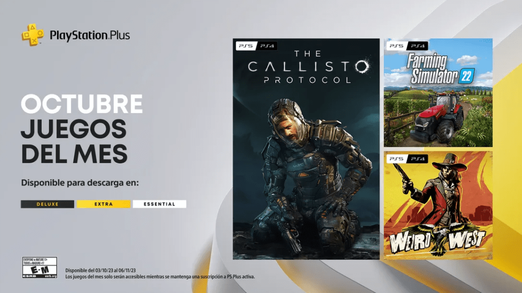 Solo tres meses nos separan del final del 2023, un año que se ha ido volando entre tantos juegos y momentos increíbles. Con la llegada de octubre queremos anunciar un nuevo line-up de juegos gratuitos que se adhieren a tu plan de PS Plus Essential, Extra o Deluxe. Desde el 3 de octubre y hasta el 6 de noviembre vive el terror en el espacio profundo, relájate controlando tu cosecha y descubre una fantasía reinventada en el Salvaje Oeste.