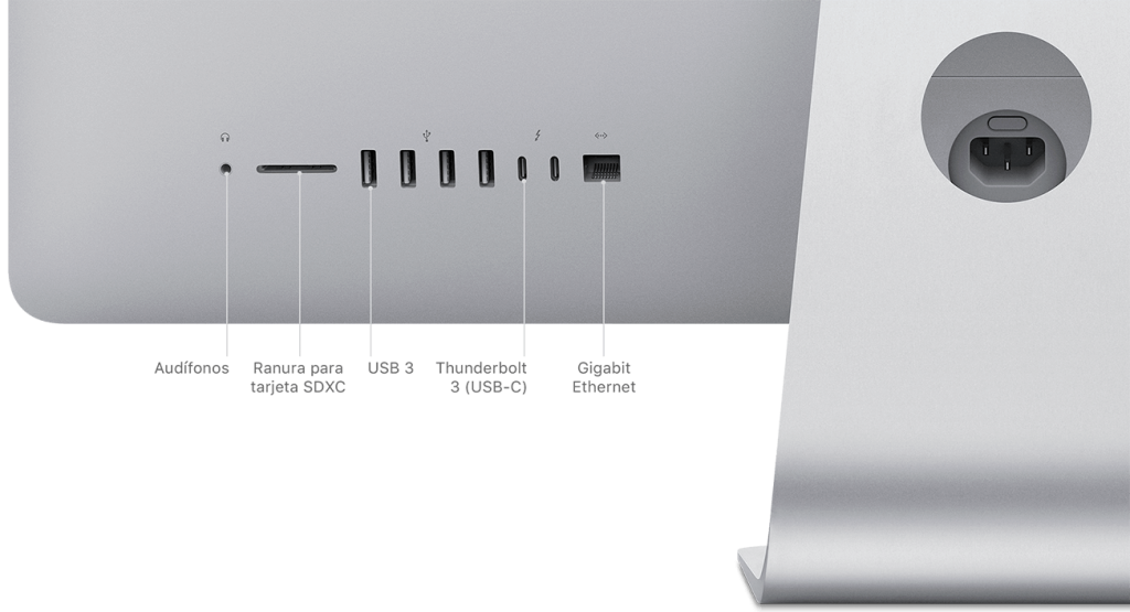 Todos los modelos de iMac cuentan con dos puertos Thunderbolt 3 (USB-C), que alcanzan velocidades de transferencia de datos de 40 Gb/s cuando usas cámaras y discos externos, y dos veces más ancho de banda para conectar dispositivos de video y monitores. Los cuatro puertos USB 3 te brindan varias opciones para conectar periféricos, como impresoras, iPhone y memorias USB.