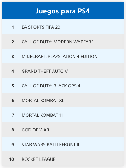 Otro de los lanzamientos más esperados de la temporada se llevó el segundo lugar en materia de títulos descargados en Playstation Store. Call of Duty: Modern Warfare, con una campaña enfocada a un público más adulto nos enfrenta a complejos tópicos éticos y morales; mientras que en tercer lugar, tenemos al viejo conocido Minecraft: PlayStation 4 Edition, un juego que a estas alturas, no requiere mayor presentación y que sigue entreteniendo a miles.
