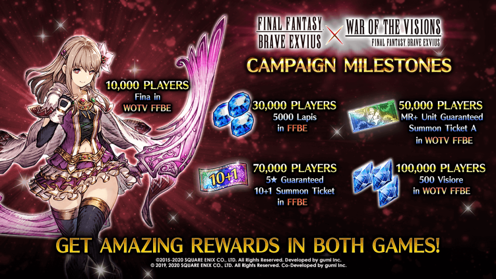 Además quienes jueguen tanto Final Fantasy Brave Exvius como War of the Visions podrán ganar premios emocionantes basándose en el número de jugadores que regresen a Final Fantasy Brave Exvius.