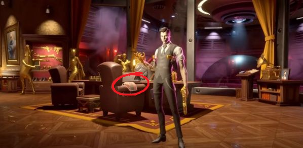 Para el primer reto, debes ir a la sección de Agentes y visitar a Midas, allí debes encontrar los shorts de Deadpool que se encuentran en el sillón detrás de Midas.