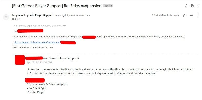 El hecho, dado a conocer por el mismo usuario en Reddit, da cuenta del correo entre el usuario y el soporte técnico de Riot, donde señalan que quizás “está ansioso por discutir la última película de los Avengers, pero spoilearla a jugadores no está bien. Debido a esto, su conducta ha sido suspendida por tres días”.