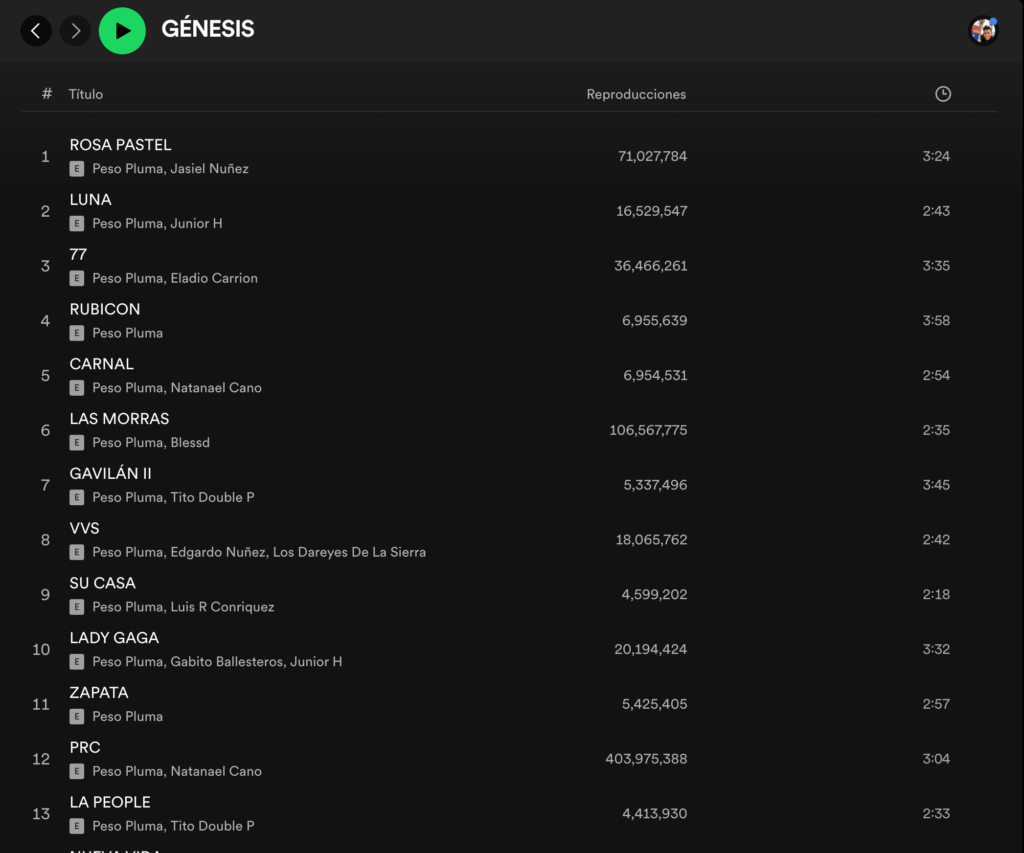 El álbum GÉNESIS del cantante de corridos «tumbados» Peso Pluma, se convirtió la semana pasada en el más escuchado a nivel global en Spotify, superando a Midnights de Taylor Swift y a la banda sonora de Spider Man “METRO BOOMIN PRESENTS SPIDER-MAN: ACROSS THE SPIDER-VERSE (SOUNDTRACK FROM AND INSPIRED BY THE MOTION PICTURE)” Lo que es algo historico en la musica de LATAM.