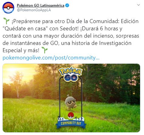 En la edición “Quédate en Casa”, Seedot, un personaje que está basado en una bellota, será el pokémon protagonista del próximo evento, que se llevará a cabo el día 24 de mayo. Su aparición en el juego aumentará y comenzará a salir en su versión variocolor. Además, al evolucionarlo desde su segundo modo Nuzleaf a Shirfy, se podrá conocer el ataque “Recurrente”.