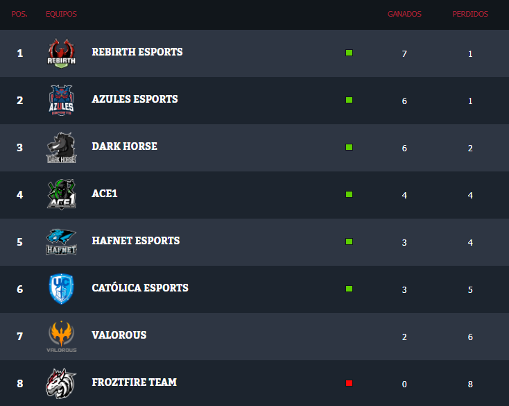 La octava fecha fue cerrada por Rebirth, quien logró sobreponerse ante los campeones del torneo de apertura chileno de League of Legends, Dark Horse, en 34 minutos y con un claro dominio de torres y 5 dragones en su haber. GGWP para el Fénix.