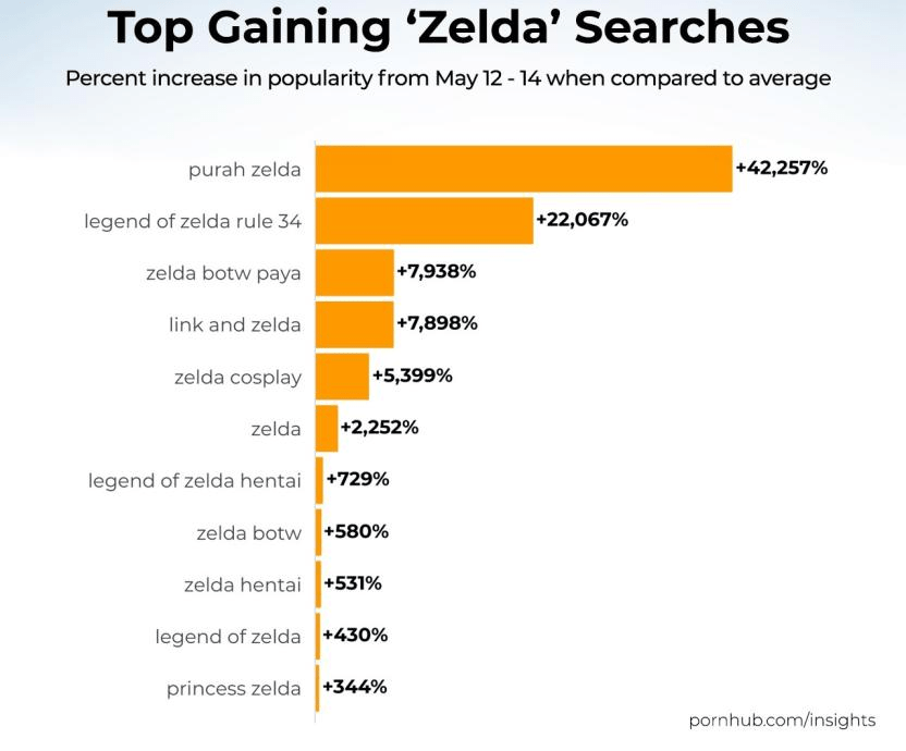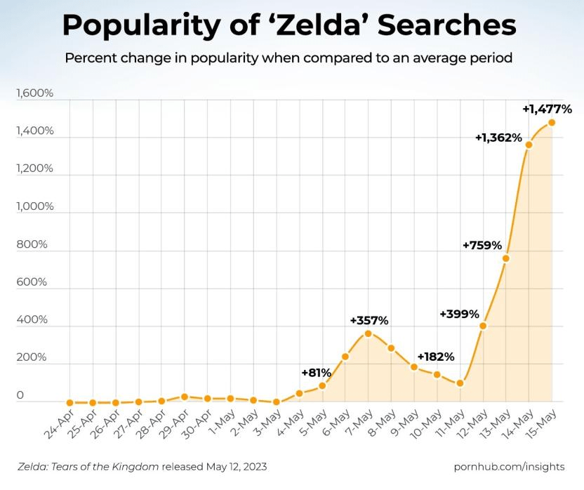 Según un reporte reciente de Pornhub Insights, se registró un alza considerable en las búsquedas del término «Purah Zelda», alcanzando un aumento del 452.257% en la última semanas. Datos que coinciden con el lanzamiento del juego más reciente de la saga desarrollada por Nintendo, que llegó al mercado el pasado 12 de mayo.
