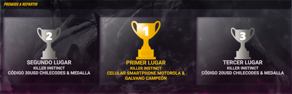 El primer lugar se llevará un smartphone Motorola & Galvano de Campeón. El segundo puesto se hará con un código de 30USD en Chilecodes & Medalla; mientras que la tercera posición tendrá un código de 20USD en Chilecodes & Medalla.